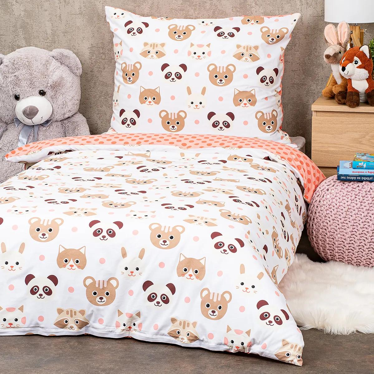Denná dávka roztomilosti do každej detskej izbičky. Bavlnené obliečky s veselými zvieratkami a rozvernými bodkami doslova rozžiaria váš domov. Mačička, zajačik, panda, medvedík a mýval budú spoľahlivo strážiť sny vašich najmenších a kvalitná 100% bavlna zaistí maximálny komfort. Môžete tak zaspávať s vedomím, že o pohodlie vašich ratolestí je postarané do najmenšieho detailu.Obliečky sú obojstranné – z jednej strany motív zvieratiek na bielej, druhá strana je ružovooranžová s bodkami. Môžete ich teda ľubovoľne kombinovať a meniť svoju posteľ každý deň. Pre maximálne pohodlie majú obliečky praktické zapínanie na zips.Súprava obsahuje: