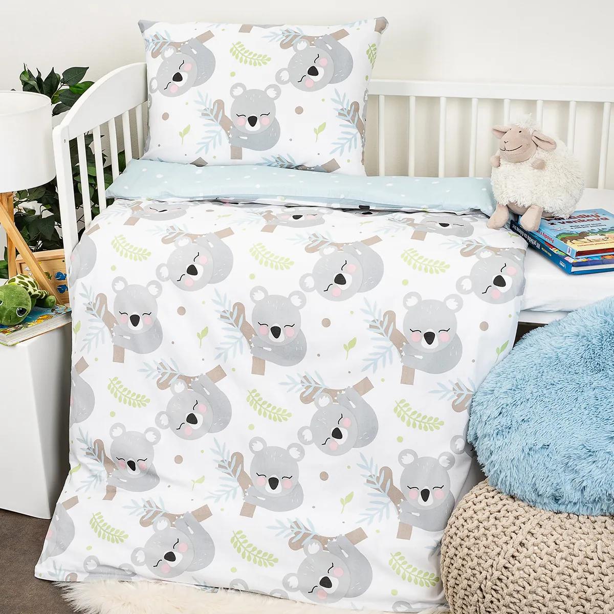 Zababušte sa do jemného koalieho kožúšku a spite pohodlne celú noc! Roztomilé detské obliečky do postieľky s koalami zaručene vykúzlia úsmev na tvári nielen milovníkom týchto malých austrálskych medvedíkov. Kúzelný motív aj jemné pastelové farby zaručia veselé ranné vstávanie a krásne rozžiaria každú detskú izbičku.Obliečky sú obojstranné – z jednej strany malé koaly na bielom podklade, druhá strana je v jemnom svetlomodrom odtieni s drobnými bodkami. Príjemná 100% bavlna je šetrná aj k citlivej detskej pokožke a prinesie maximálne pohodlie po celú noc. Praktické zapínanie na zips.Súprava obsahuje: