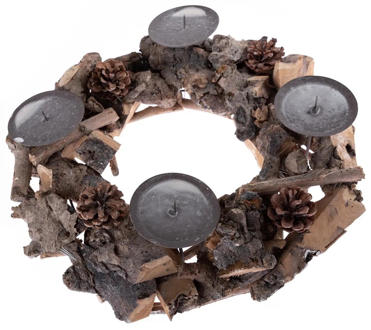 Krásny drevený svietnik vás skvele naladí na adventný čas. Základ tvoria rôzne veľké drevá a šišky. Podstavce na štyri sviečky s tŕňmi na zapichnutie sú v sivej farbe.