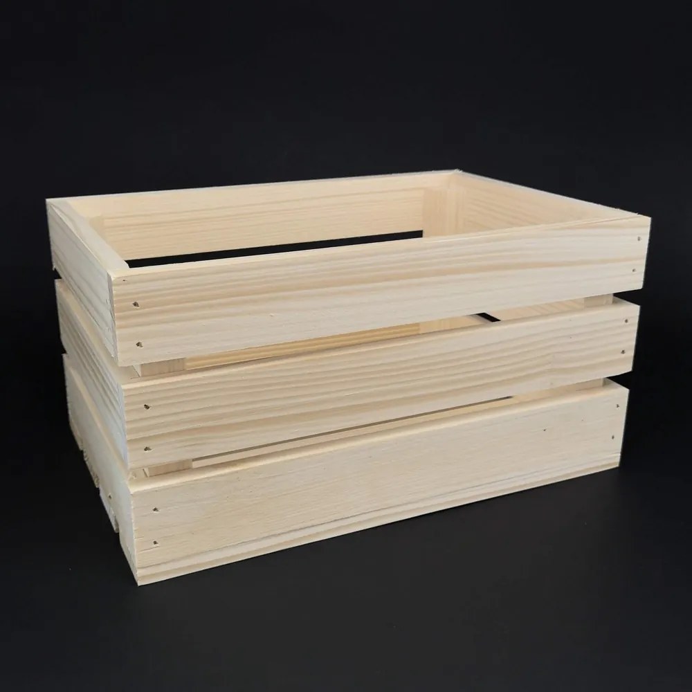 Drevená debnička z masívneho smrekového dreva, rozmery 29 x 19 x 15 cm, objem 8 l, nosnosť 15 kg. Krabicu možno použiť na ukladanie a organizovanie vecí, ale aj ako základňu pre darčekový kôš. Otvory zabezpečujú cirkuláciu vzduchu. Výrobok je bez povrchovej úpravy.