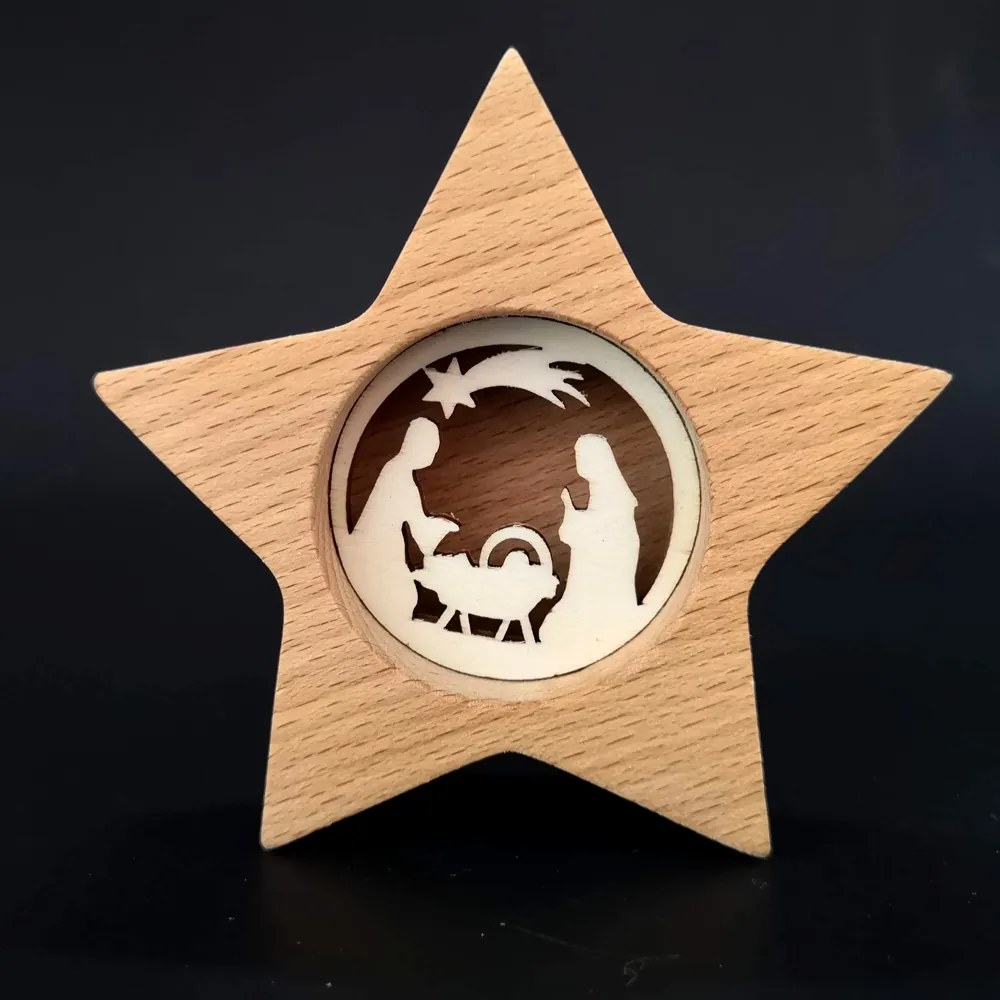 Drevená dekorácia v tvare hviezdy s vložkou do postieľky je vyrobená z masívneho bukového dreva a vložka je vyrobená z topoľovej preglejky. Rozmery sú 10 x 10 x 3 cm. Drevo je na povrchu ošetrené prírodným olejom.