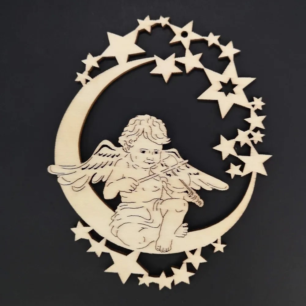Drevená ozdoba anjel na mesiaci s husľami 9 cm