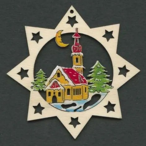 Drevená ozdoba farebná hviezda s kostolom 6 cm