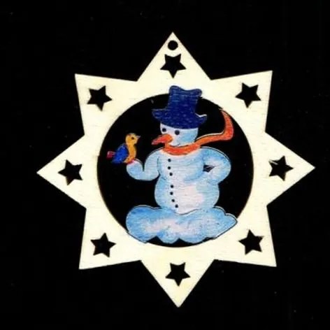 Drevená ozdoba farebná hviezda so snehuliakom 9 cm