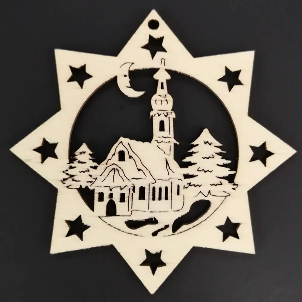 Drevená ozdoba hviezda s kostolom 9 cm
