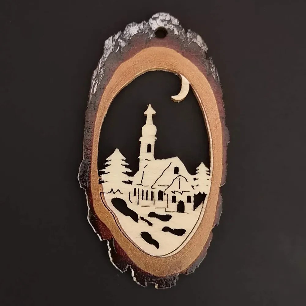 Drevená ozdoba s potlačou kôry – ovál s kostolom 6 cm