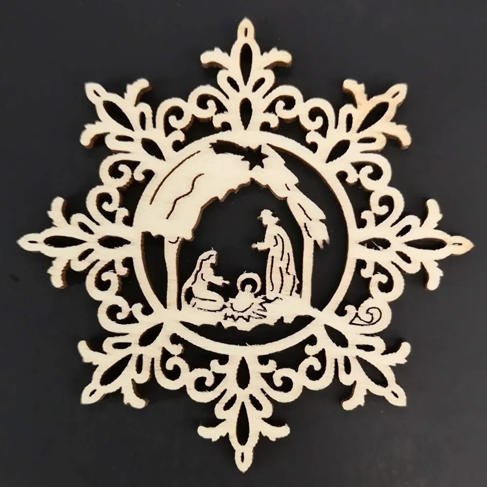 Drevená ozdoba vločka s betlehemom 9 cm