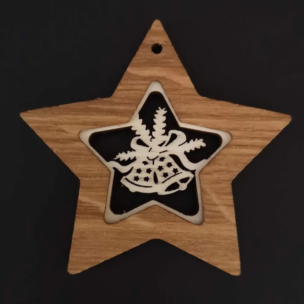 Drevená ozdoba z masívu s vkladom – hviezda so zvončekmi 8 cm