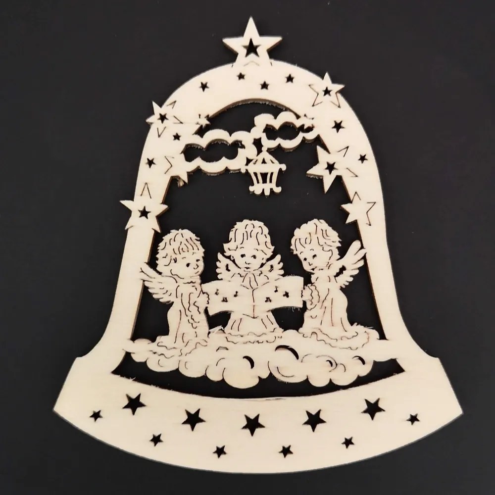 Drevená ozdoba zvon s anjelmi 9 cm