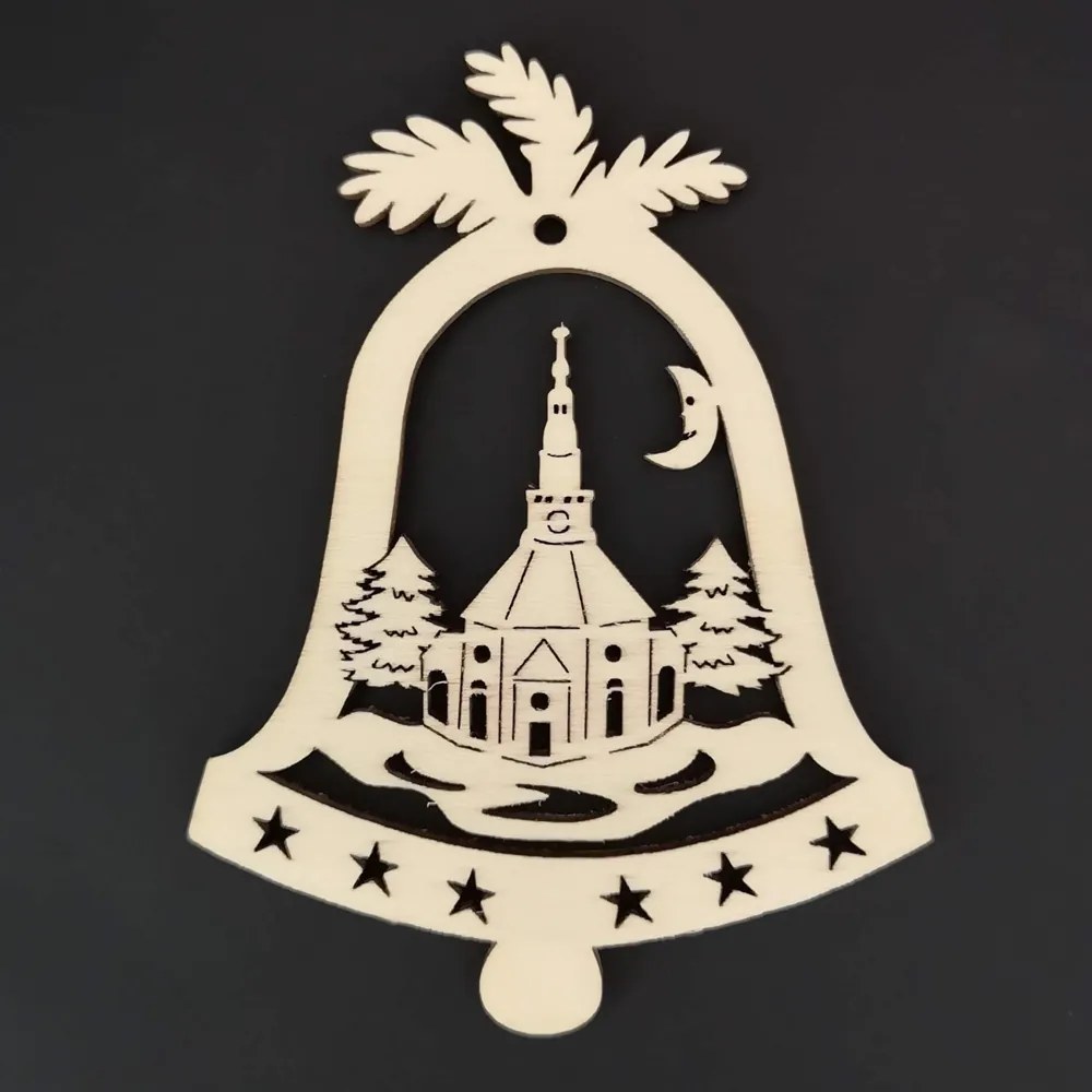 Drevená ozdoba zvonček s kostolom 9 cm