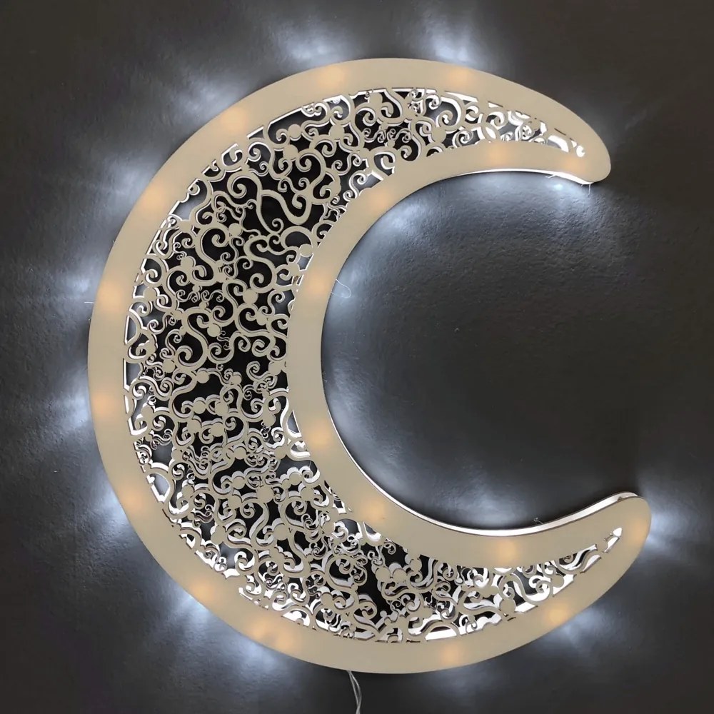 Drevená dekorácia mesiaca s LED osvetlením je vyrobená z topoľovej preglejky. Veľkosť dekorácie je 30 x 27 cm. Podsvietenie LED je na batérie – 3 AA, hviezda je zabalená v darčekovej škatuľke s priehľadným viečkom.