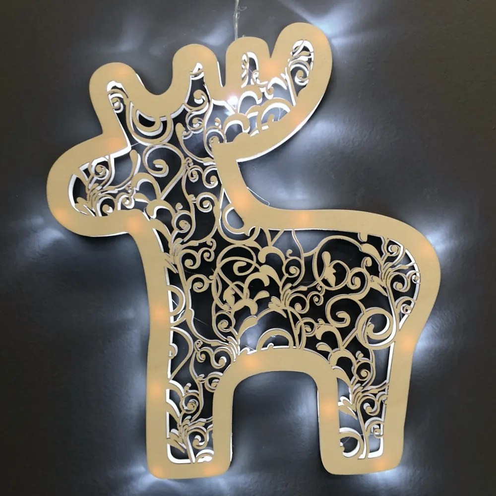 Drevená dekorácia soba s LED osvetlením je vyrobená z topoľovej preglejky. Veľkosť dekorácie je 31 x 27 cm. Podsvietenie LED je na batérie – 3 AA, hviezda je zabalená v darčekovej škatuľke s priehľadným viečkom.
