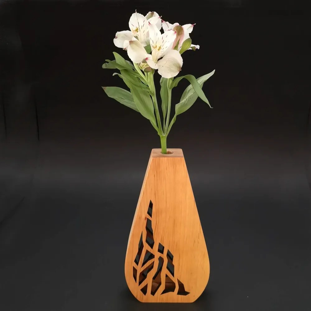 Drevená okrúhla váza v tvare trojuholníka s originálnym rezom je vyrobená z masívneho jelšového dreva, váza má rozmery 23 x 13 x 4 cm, vo vnútri vázy je sklenená trubička umožňujúca vloženie kvetu, váza je na povrchu ošetrená voskom.