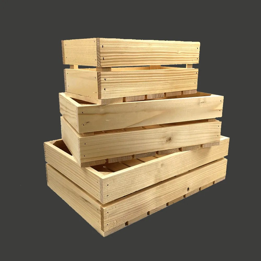 Drevená súprava 3 boxov z masívneho smrekového dreva dobre poslúži na ukladanie a organizovanie najrôznejších vecí. Otvory zabezpečujú cirkuláciu vzduchu. Súprava pozostáva z troch veľkostí boxov – najmenší 28x15x12 cm (dĺžka/šírka/výška), objem 5 l, stredný 34x21x12 cm (dĺžka/šírka/výška), objem 8 l a najväčší 40x27x12 cm (dĺžka/šírka/výška), objem 12 l. Krabice sú bez povrchovej úpravy a majú nosnosť 15 kg.