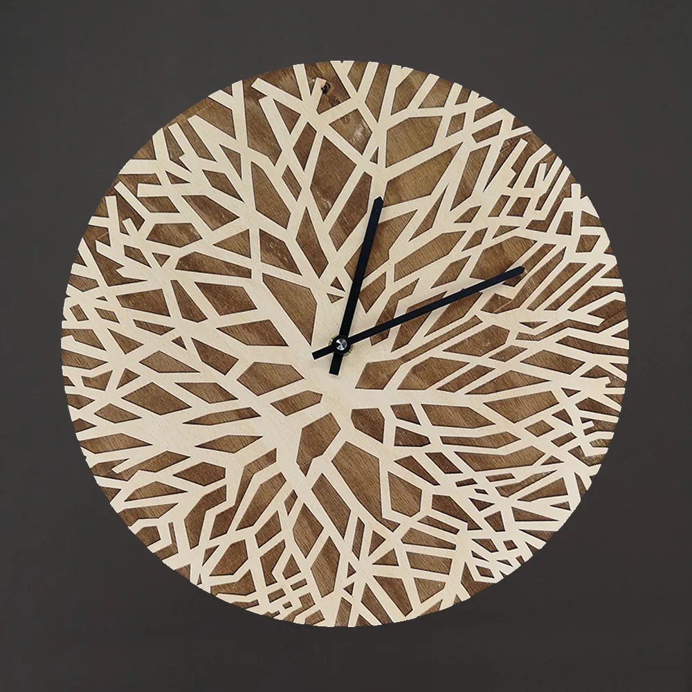 Drevené nástenné hodiny so vzorom vetvičiek sú vyrobené z masívneho lipového dreva. Veľkosť je 25 x 25 cm. Hodinový strojček je značky QUARTZ vyrobený v Nemecku, má tichý chod, batéria AA 1,5 V. Český výrobok.