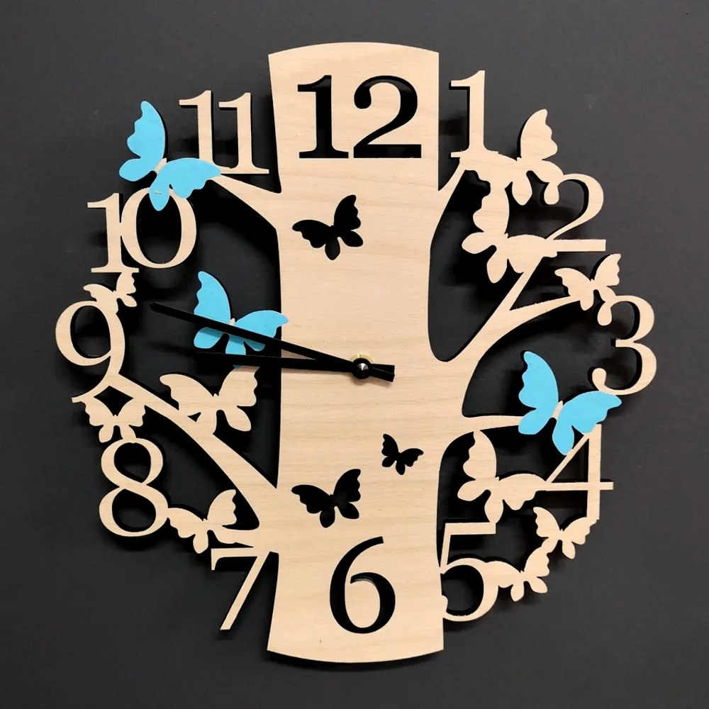 Drevené nástenné hodiny s vyrezávaným stromom s motýľmi sú vyrobené z bukovej preglejky, rozmery sú 30 x 29 cm, hodiny sú na povrchu ošetrené voskom. Hodiny sú balené v darčekovej škatuľke s priehľadným viečkom. Hodinový strojček je značky QUARTZ vyrobený v Nemecku, má tichý chod, batéria AA 1,5 V. Český výrobok.