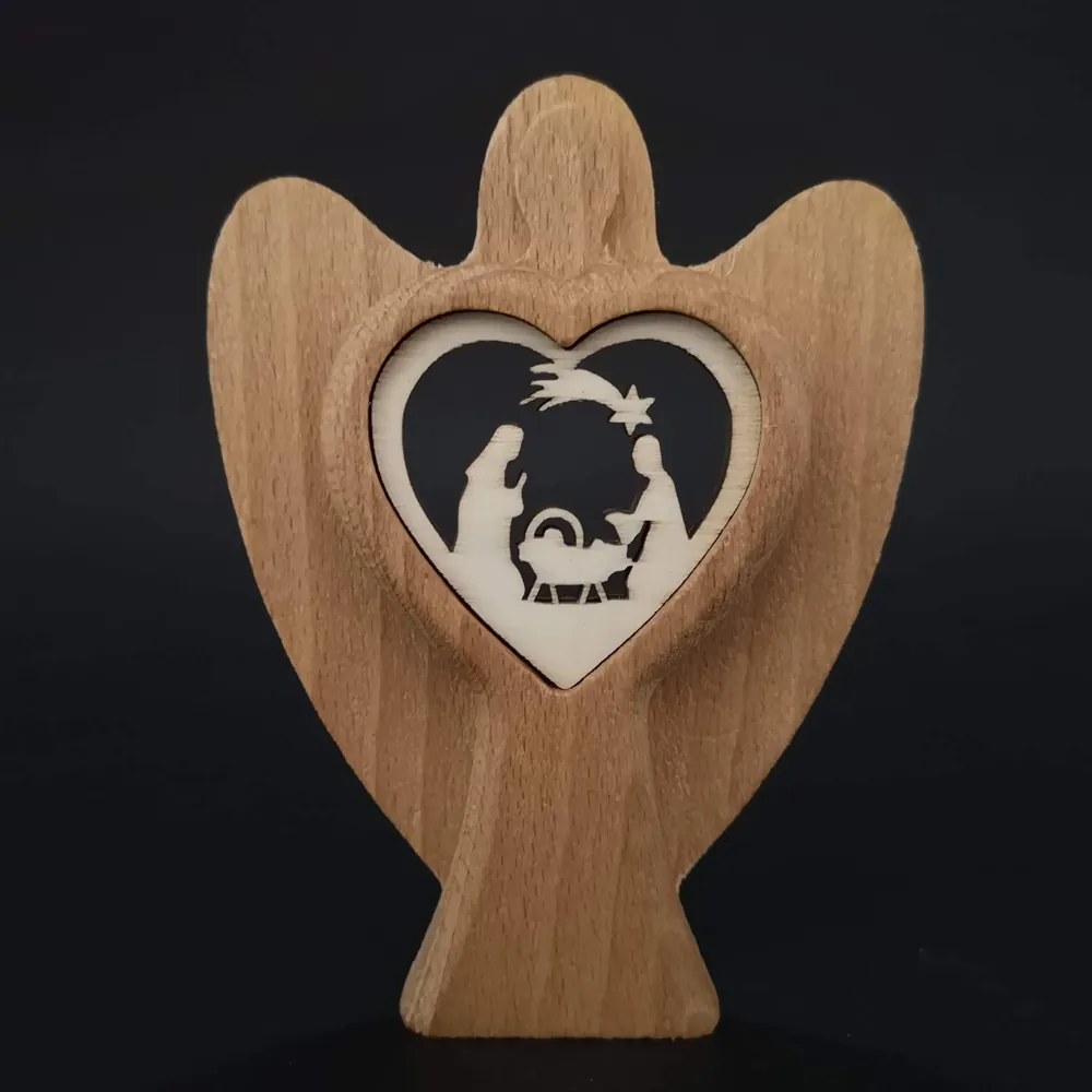 Drevená dekorácia anjel so srdcom, ktorá má vložku v tvare jasličiek, je vyrobená z masívneho bukového dreva a vložka je z topoľovej preglejky. Rozmery sú 11 x 8,30 x 1,50 cm. Drevo je na povrchu ošetrené prírodným olejom.