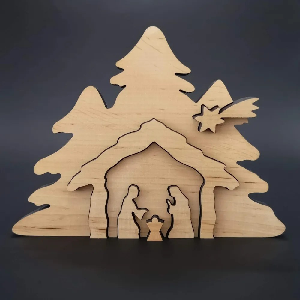 Tradičný drevený stupňovitý betlehem je vyrezaný z masívneho jelšového dreva a má rozmery 19 x 14 x 1,1 cm. Výzdoba zobrazuje Svätú rodinu. Betlehem sa skladá z niekoľkých častí a drevo je na povrchu ošetrené voskom.