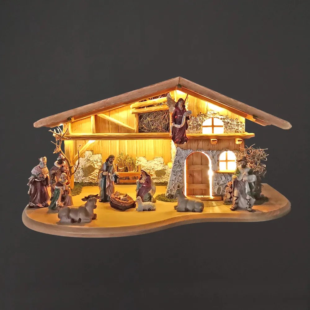 Tradičný ručne vyrábaný betlehem z masívneho smrekového dreva, do ktorého každé Vianoce naaranžujete figúrky, čo je tiež obľúbená činnosť detí. Súčasťou betlehemu sú ručne maľované figúrky s veľkosťou 11 cm – kód 34218. Betlehem alebo tiež jasličky sú umeleckým zobrazením Svätej rodiny. Rozmery postieľky sú 64,5 x šírka 35 x výška 32 cm, postieľka je vyrobená z masívneho smrekového dreva, je na podstavci a má ručne opracované detaily, vyrobené výlučne z prírodných materiálov, ako je mach, seno, bridlica. Na stenách je použitá omietka a kríky sú vyrobené z vetvičiek. K Vianociam patria tradície a tento betlehem s figúrkami je dokonalou tradičnou dekoráciou. Postieľka je osvetlená svetelnou reťazou s led diódami, ktorá je zakončená konektorom USB-A, sieťový adaptér nie je súčasťou balenia. Môžete použiť štandardnú nabíjačku mobilného telefónu alebo powerbanku. Český výrobok