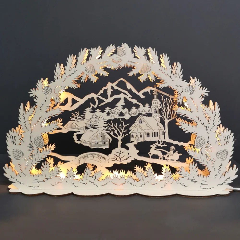 Drevená dekorácia s motívom zimnej dediny s kostolom je vyrobená z topoľovej preglejky. Dekorácia je s LED podsvietením s pripojením do zásuvky 230 V. Portál má rozmery 53 x 21 x 9,5 cm a je zabalený v darčekovej škatuli s priehľadným vekom.