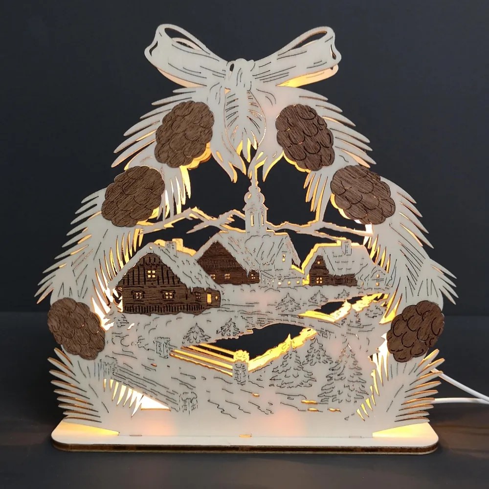Drevený dekor s motívom zimnej dediny je vyrobený z topoľovej preglejky a hnedé časti sú z mahagónovej dyhy. Dekorácia je s LED podsvietením s pripojením do zásuvky 230 V. Dĺžka kábla je 140 cm. Portál má rozmery 25 x 25 x 4,50 cm a je zabalený v darčekovej škatuli s priehľadným vekom.