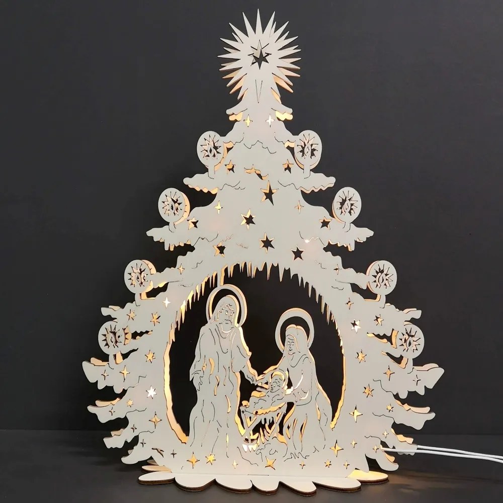 Drevená výzdoba osvetleného portálu s motívom stromu s betlehemom je vyrobená z topoľovej preglejky. Dekorácia je s LED podsvietením s pripojením do zásuvky 230 V. Portál má rozmery 46 x 36 x 10 cm a je zabalený v darčekovej škatuli s priehľadným vekom.