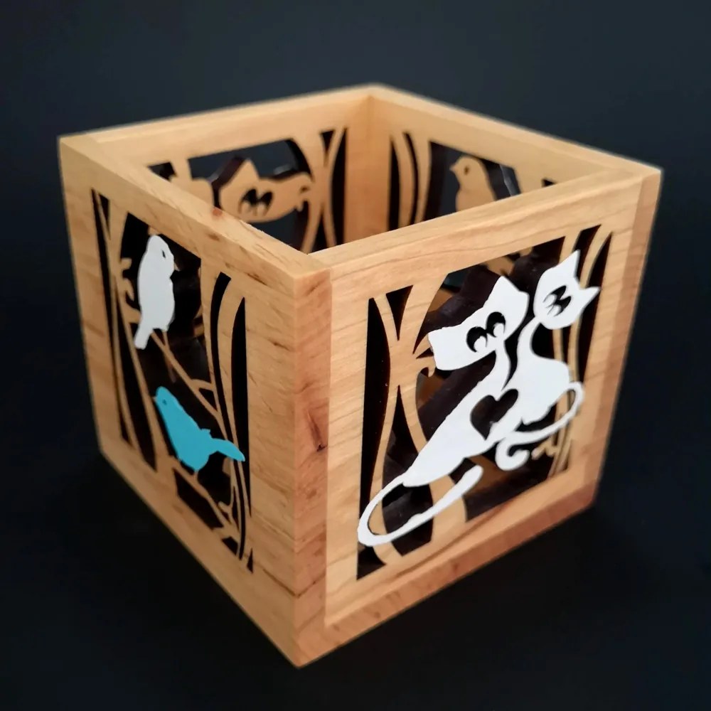 Drevený svietnik v tvare kocky s farebným motívom vtáka a mačky je vyrobený z masívneho jelšového dreva. Veľkosť je 10 x 10 cm. Vo vnútri svietnika sa nachádza otvor a sklenený pohár na čajovú sviečku. Drevo svietnika je na povrchu ošetrené prírodným olejom.
