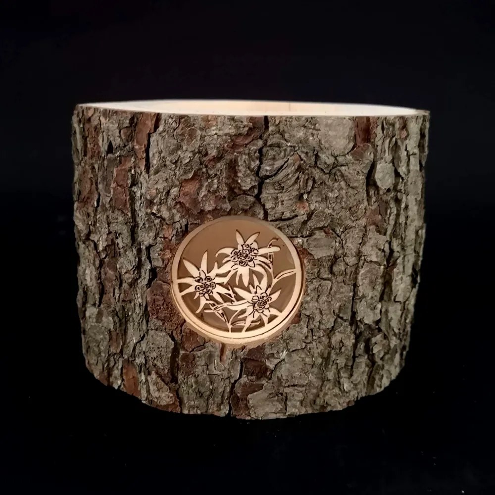 Drevený svietnik z kôry s kvetinovou vložkou je vyrezaný z masívneho jelšového dreva a vložka je vyrobená z topoľovej preglejky. Vo vnútri svietnika je drevený podnos na čajovú sviečku. Táto prírodná dekorácia má rozmer 12 cm.