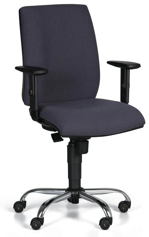· kancelárska pracovná stolička s vysokým štandardom konštruovaná tak, aby odvádzala statickú elektrinu z pracoviska s prítomnosťou elektronických komponentov a prchavých chemikálií · všetky súčasti stoličky, vrátane špeciálnej látky a koliesok sú vodivé · synchrónny mechanizmus, päťnásobná aretácia, možnosťou plynulej zmeny uhla sedadla a operadla · meraný odpor: 0,1 MOhm · odtieň poťahu – tmavo sivá (antracit), chrómovaná oceľová báza · kolesá sú tvrdé, vhodné pre mäkké podlahy · nosnosť 130 kg