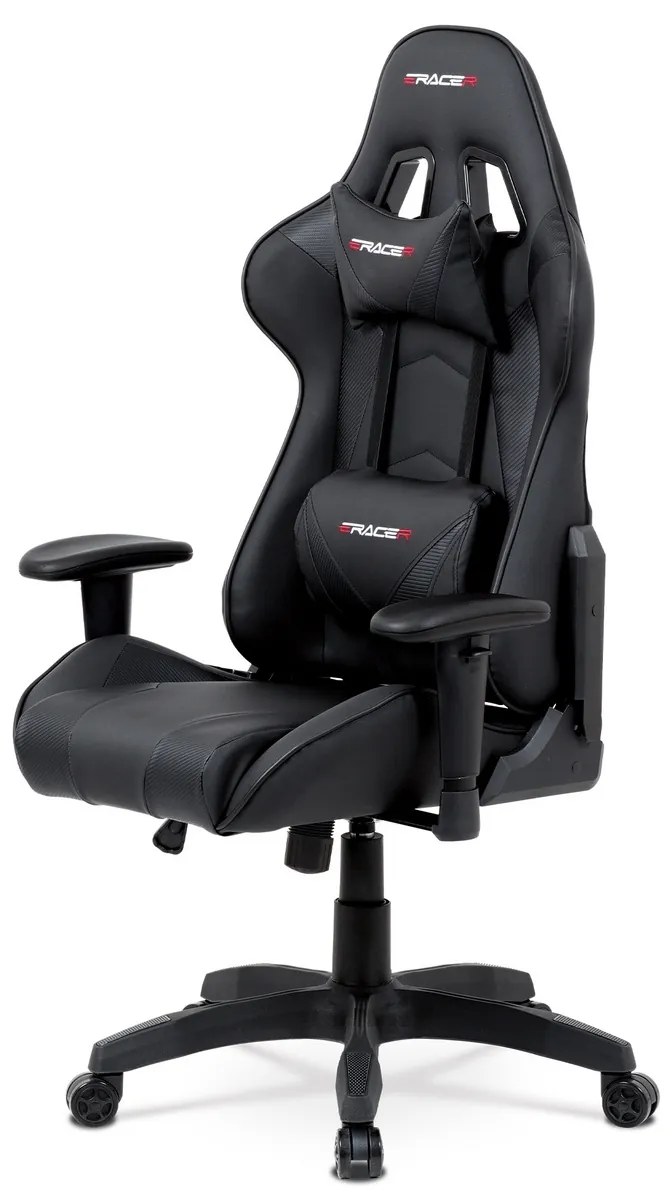 Kancelárska stolička v prevedení čierna ekokoža s detailmi v dekore “CARBON”. Univerzálne pogumované kolieska, plastový kríž, výškovo nastaviteľné podrúčky, polohovateľné operadlo až do polohy 180°, hojdací mechanizmus s možnosťou nastavenia tuhosti podľa váhy užívateľa, to všetko ponúka štýlová kancelárska stolička vhodná na herné účely. Súčasťou stoličky sú 2 odnímateľné vankúšiky.