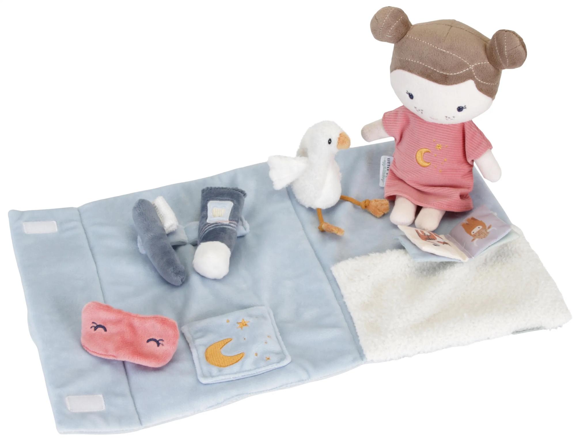 Originálna sada s bábikou v krásnom prevedení z jemného plyšového materiálu. Rosa je nachystaná na prespanie u kamarátky a má so sebou všetko potrebné: perinku, plyšáčika v podobe rozkošnej húsky, kefku s pastou, knižku na čítanie pred spaním a masku na oči. Rovnako ako si vaše deti užívajú spanie u babičky alebo u kamarátov, bude si aj Rosa užívať svoj pobyt na návšteve u vás doma.