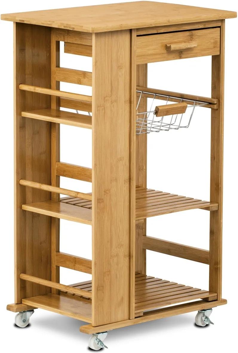 Praktický servírovací stolík s policami sa bude hodiť do každej domácnosti. Má kolieska s brzdami, vďaka ktorým ho bez problému presuniete kam potrebujete. Okrem políc môžete veci uložiť aj do kovového košíka a do zásobníka na fľaše si umiestniť napríklad obľúbené víno. Kostra je z lakovaného masívneho štiepaného bambusu v prírodnom odtieni.Celková nosnosť je do 10 kg. Jednotlivé poličky / zásuvky majú nosnosť max. do 2 kg.
