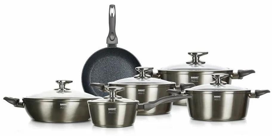 Sada hliníkového liateho kovaného riadu s veľmi kvalitným nepriľnavým povrchom. Môžete v ňom variť, smažiť, dusiť, opekať a zapekať s minimálnou spotrebou tuku. Pripravovaný pokrm sa nepripeká. Pokrievka s otvorom na únik prebytočnej pary. Vhodné na všetky typy spotrebičov vrátane indukcie aj rúry (okrem panvice). Pri užívaní odporúčame používať kuchynské chňapky.Pri plynových sporákoch voľte správnu veľkosť plameňa, pri elektrických, sklokeramických a indukčných varičoch je nutné zvoliť zodpovedajúcu veľkosť platničky. Pripravené jedlo môžete pohodlne skladovať v hrncoch aj v chladničke. Nepriľnavý povrch je veľmi tvrdý a odolný voči poškriabaniu. Výrobky v sade sú odolné proti nárazu a deformácii tvaru. Vysoká tepelná vodivosť zaisťuje rýchle a ekonomické varenie – dlho drží teplotu.Materiál: riad: liaty hliník, držadlá: plast, pokrievka: sklo a nehrdzavejúca oceľSada obsahuje: