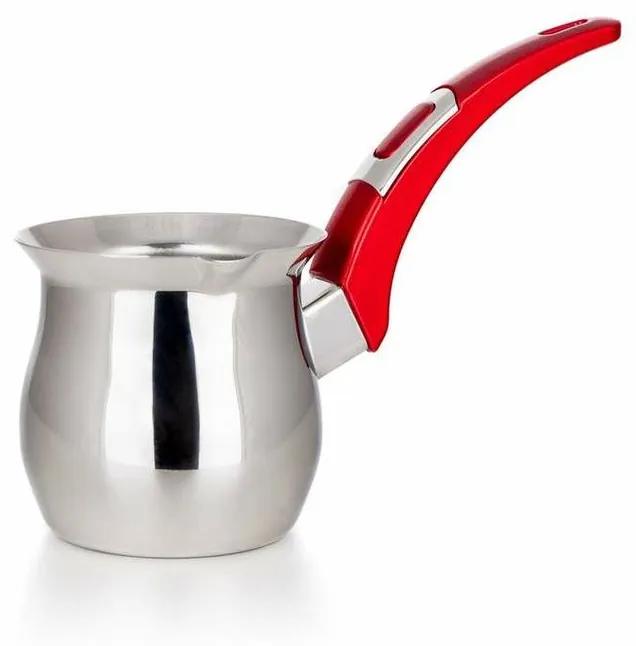 Džezva VISTA RED so zaoblenou rukoväťou s objemom 350 ml, je vyrobená z nehrdzavejúcej ocele 18/10, hrúbka steny 0,70 mm. Má sendvičové dno s vysokou tepelnou vodivosťou. Po umytí nutné vysušiť mäkkou handričkou.