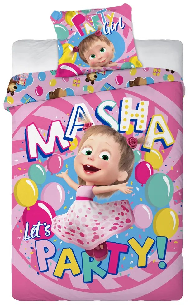 Detské bavlnené obliečky s motívom MÁŠA A MEDVEĎ, so zapínaním na zips. Rozmer prikrívky 140x200cm, rozmer vankúša 70x90cm.