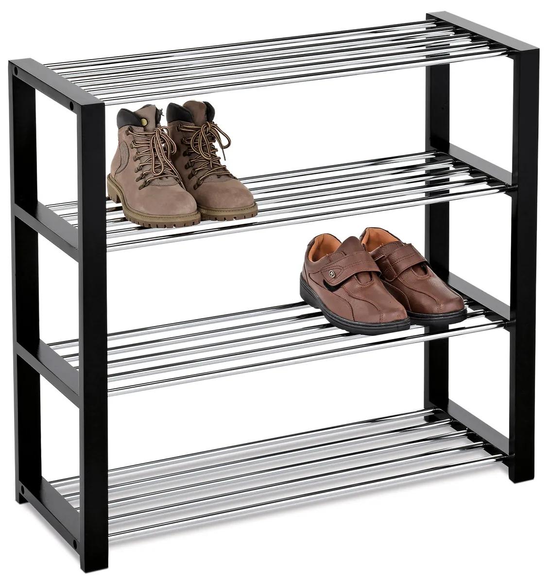 Praktický drevený botník so štyrmi kovovými roštami. S týmto nábytkom budú rozhádzané topánky po predsieni už len minulosťou. Vďaka svojim rozmerom má výbornú ložnú plochu na uloženie topánok, ale priestorovo sa zmestí aj do menších predsiení. Kostra botníku je z masívneho kaučukovníkového dreva v čiernom matnom laku. Rošty sú z kovových chrómovaných rúrok s priemerom. 12 mm. Nosnosť jednotlivých políc je 4 kg.Technické parametre:
