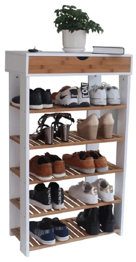 Botník NUGET TYP 2 Materiál: MDF / borovicové dřevo Barva: bílá / přírodní Rozměry (ŠxHxV): 60x29x101 cm 5 řadový Se zásuvkou Dodávané v demontu.