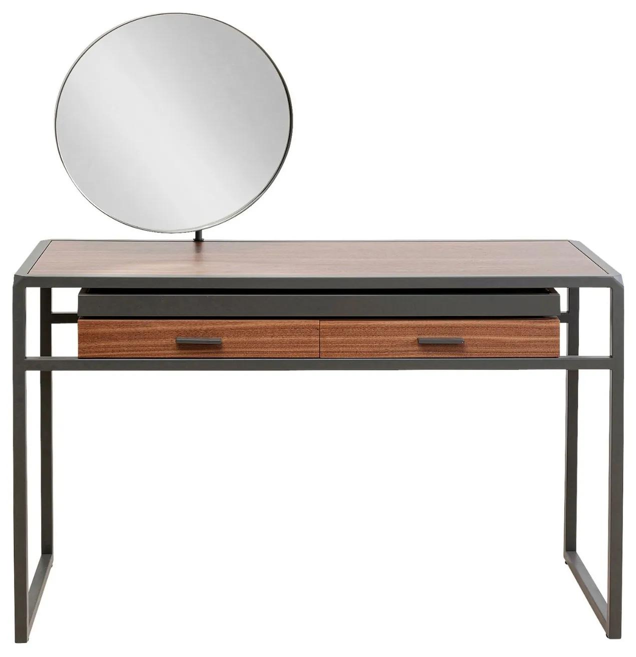 Toaletný stolík s jemnou orechovou dyhou a kovovým rámom bude ozdobou šatne alebo kozmetického kútika v spálni.