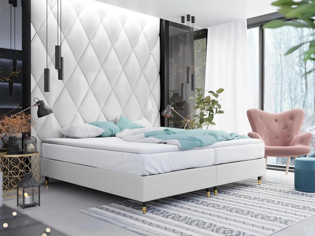 Hľadáte posteľ, ktorá bude stáť pri dekoratívnej stene, napríklad z čalúnených panelov? Máme niečo pre vás – čalúnenú manželskú posteľ Estella! Je vyrobená z kvalitnej čalúnnickej látky v módnych farbách. Ďalším ozdobným akcentom postele sú vysoké nohy so zlatými akcentmi.Súčasťou súpravy je aj matrac. Jeho konštrukcia pozostáva z pružín typu bonell a vrstvy peny na oboch stranách, čo zaručuje zdravý a pohodlný spánok. Vrchnú vrstvu matraca tvorí priedušný bavlnený poťah. Poťah môžete prať v práčke. Rozmery:140: dĺžka: 200 cm, šírka: 140 cm, výška: 30 cm, plocha na spanie: 200 x 140 cm,160: dĺžka: 200 cm, šírka: 160 cm, výška: 30 cm, plocha na spanie: 200 x 160 cm,180: dĺžka: 200 cm, šírka: 180 cm, výška: 30 cm, plocha na spanie: 200 x 180 cmFarba: môžete si vybrať vyššieVykonanie postele:bočné strany z MDF dosky s hrúbkou 1,8 cm,vrchná MDF doska s hrúbkou 0,6 cm,podperné nohy z vnútornej strany, hrúbka 5 cm (6 ks),nohy: drevo + kov,vrátane matraca v jednom kuse pre veľkosti 140, 160 aj 180 cmžiadny kontajner na podstielkuPevedenie matraca Piano:vložka: 2 cm hrubá polyuretánová pena na oboch stranách,pružiny Bonell,prešívaný poťah vhodný na pranie pri 40 stupňoch C,zips v tvare písmena C,antialergický,hypoalergénne,z bavlnenej tkaniny s gramážou 150-200 gr./m2,odporúča sa matrac otáčať každé 2-3 mesiace,obojstranne,poťah je vyrobený zo 100 % polyesteru,výška matraca: približne 17 cmZáruka: 24 mesiacovPoznámka: Posteľ je dodávana bez čela.