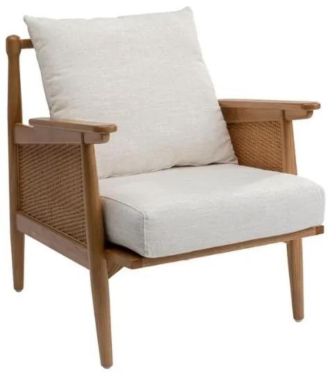 Nadčasové kreslo Cane z masívneho dreva s prútenými opierkami a béžovým čalúnením.