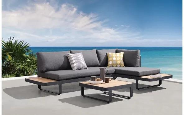 Kolekcia Carribean je charakteristická dvomi jednoduchými bočnými mini-stolíkmi. Komfort sa stáva dostupnejším vďaka sedadlám vyrobených z textilných panelov. Výrazný prvkom je prírodné tíkové drevo, ktoré slúži ako estetický doplnok ale aj odkladací priestor pre veci dennej potreby. Carribean stelesňuje moderný životný štýl mladej generácie. Rozmery: Stolík 73 x 73 cmSedačka 255 x 176 cm Materiál: Hliníková konštrukcia, tíkové drevo Matrace a vankúše sú súčasťou zostavy.