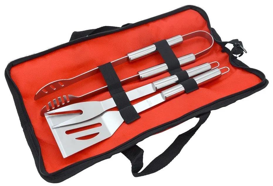 Kúpte si túto kvalitnú sadu na grilovanie, kde nájdete obracačku, vidličku a kliešte. Obracačka má precízne zabrúsenú hranu a odtokové otvory pre otáčanie mäsitých ale aj iných pokrmov. Kliešte sú špeciálne tvarované pre pevný úchop. Náradie nie je nijako zbytočne tvarované, čo uľahčuje čistenie. Rukoväte sú z kruhového prierezu a výborne padnú do ruky. Všetky nástroje možno zavesiť na háčik.Celá sada je úhľadne umiestnená v transportnej taške malých rozmerov so zapínaním na zips. Sadu tak využijete ako doma v záhrade, tak aj na cestách.Technické parametre: