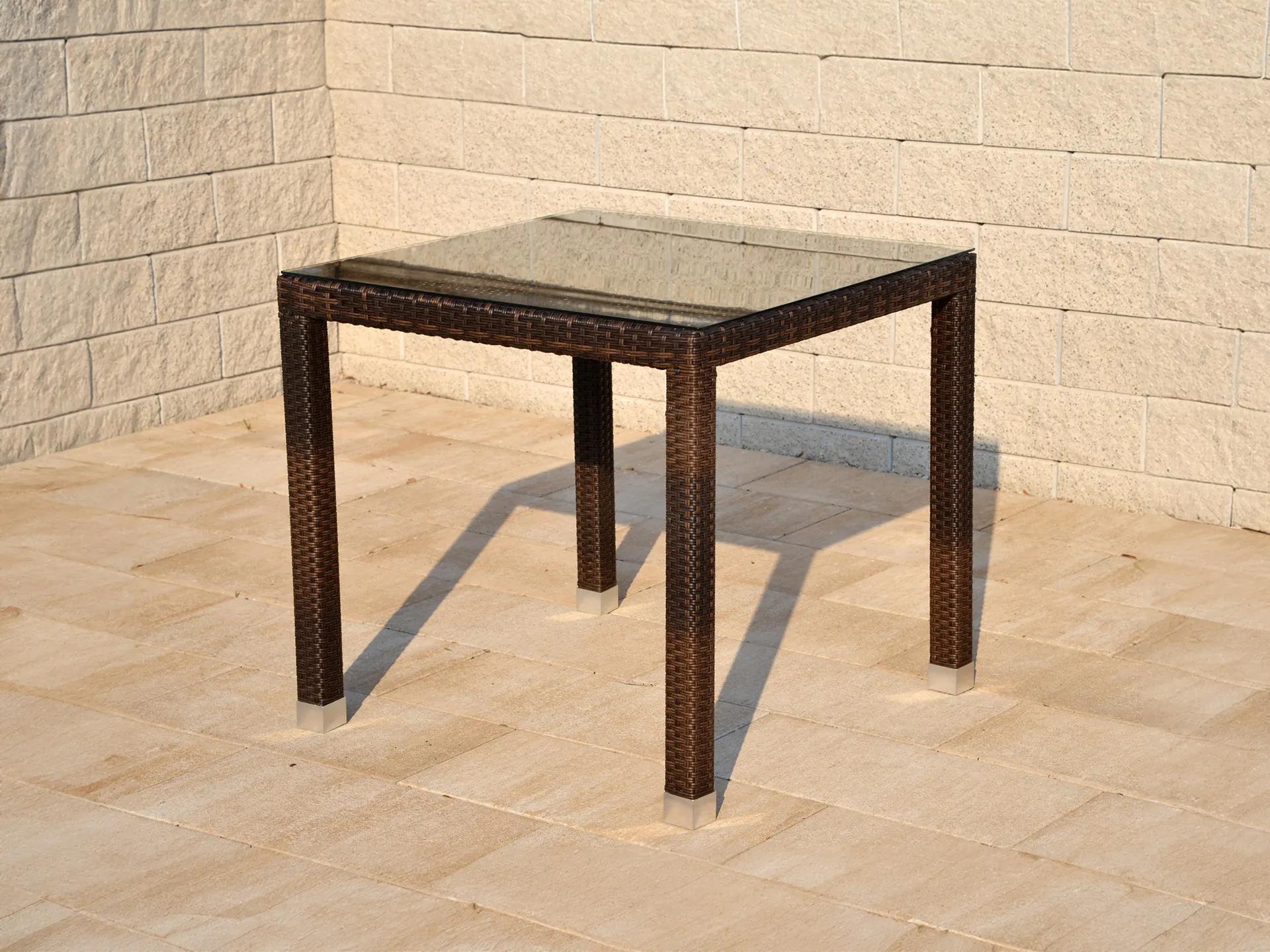 Moderný ratanový stôl zo série Cuba v hnedom farebnom prevedení so sklenenou platňou z tvrdeného skla pre praktické a rýchle čistenie.