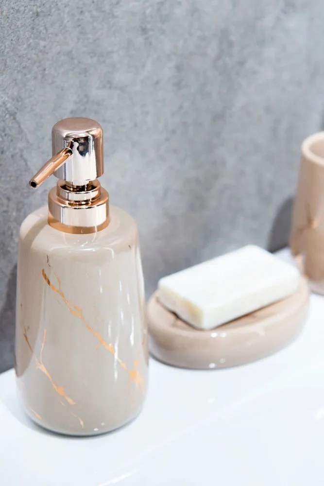 Dávkovač tekutého mydla nesmie chýbať v žiadnej kúpeľni. Ideálnou voľbou do tej vašej môže byť dávkovač zo série Diosa. Je vyhotovený v béžovej farbe so zlatým vzorom, ktorý dodáva kúpeľni luxusný vzhľad. Vyrobený je z keramiky, ktorá je vysokokvalitným a odolným materiálom. Vyznačuje sa svojim hladkým a lesklým povrchom. Tento dávkovač tekutého mýdla je vybavený kvalitným dávkovacím mechanizmom, ktorý umožňuje jednoduché a presné dávkovanie mydla bez zbytočného plytvania. Hlavica pumpičky je skrutkovacia, vďaka čomu sa s dávkovačom pri jeho plnení jednoducho manipuluje a zároveň sa aj ľahko čistí. Zlaďte si kúpeľňové doplnky v jednom štýle. Z kúpeľňovej súpravy Diosa si môžete vybrať aj mydelničku, pohár alebo WC kefu.