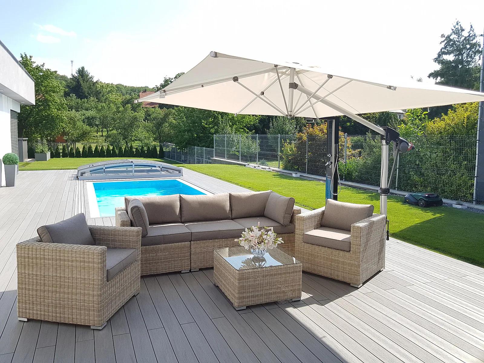 Ratanový nábytok z kolekcie modulových setov, ktorý vyniká svojou variabilitou.Zostavte si súpravy podľa Vašich predstáv.Umelý ratan sa pýši svojím nadčasovým dizajnom a takmer nulovú údržbou. Polyetylénové vlákno sa vyznačuje vysokou pružnosťou, pevnosťou a odolnosťou voči vlhkosti i UV žiareniu. Je odolný voči povětrmostním podmienkam a je vhodný na celoročné státie vonku (odporúčame pod zastrešením alebo ochranným obalom v zimných mesiacoch). Umelý ratan je ľahký, takže zaisťuje pohodlnú manimulaci záhradného nábytku po záhrade či terase.Konštrukcia je vyrobená z robustnej hliníkovej konštrukcie, ktorá je zvarená tak, aby zaistila vysokú nosnosť jednotlivých prvkov. Hliník sa vyznačuje vysokou odolnosťou a pevnosťou. Nedochádza ku korózii.Polstrovanie je v sile 10 cm, jedná sa o látku s hustotou 220 g/m2. Lemovanie po krajoch. Penová výplň. Všetky podušky sú vybavené zipsom. Možnosť prania v práčke na 40 ° C bez aviváže.