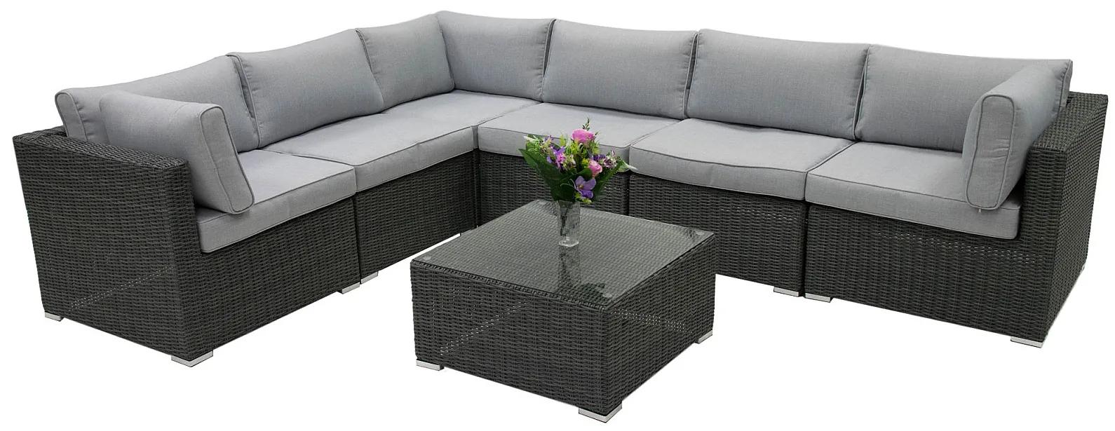 Nastaviteľná rovinnosť pomocou nožičiek. Sestava obsahuje: 3x Ratanový rohový diel SEVILLA (antracit), 3x Ratanový stredový diel SEVILLA (antracit), 1x Ratanový stolík/taburet SEVILLA (antracit)