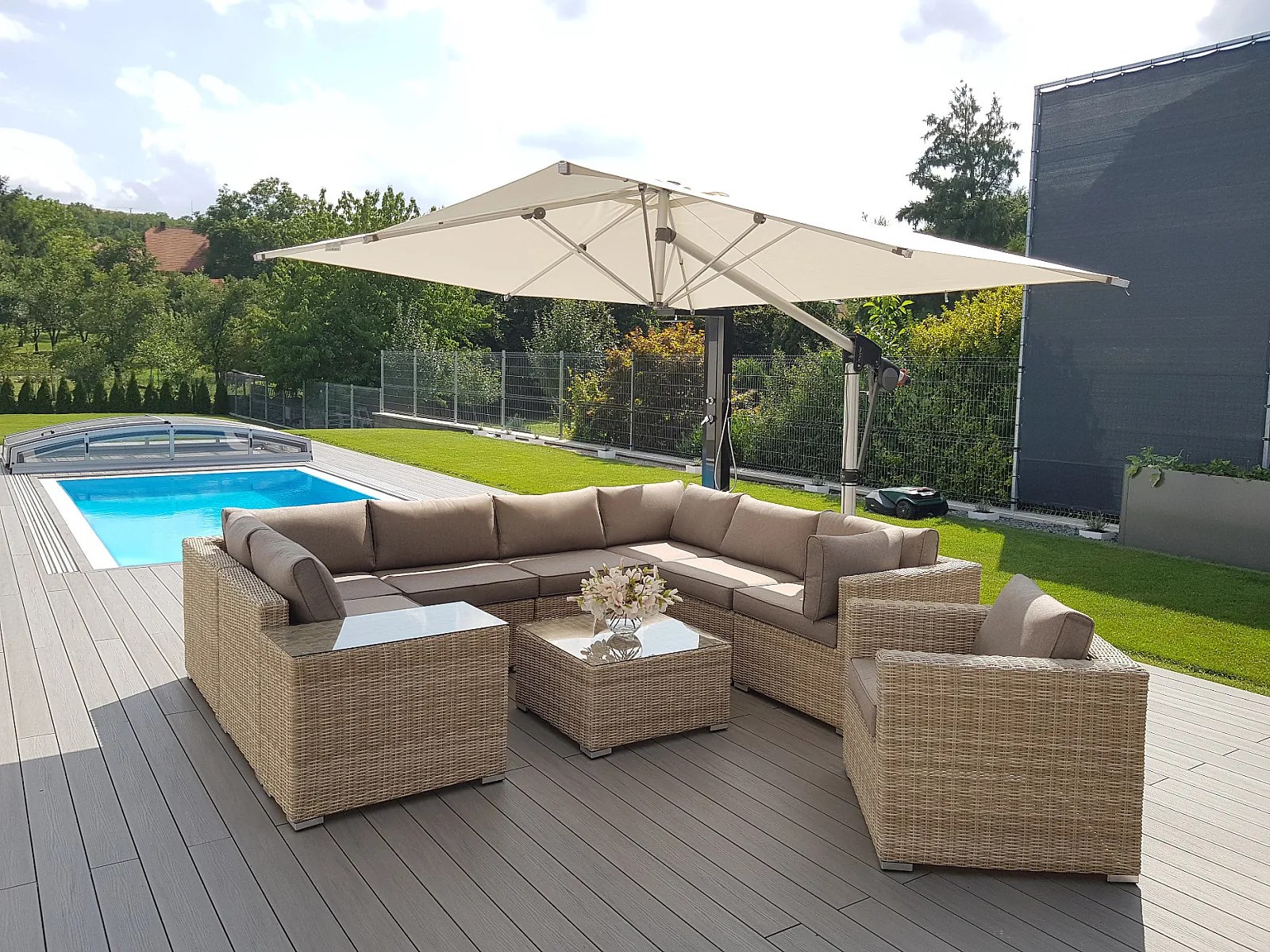 Ratanový nábytok z kolekcie modulových setov, ktorý vyniká svojou variabilitou.Zostavte si súpravy podľa Vašich predstáv.Umelý ratan sa pýši svojím nadčasovým dizajnom a takmer nulovú údržbou. Polyetylénové vlákno sa vyznačuje vysokou pružnosťou, pevnosťou a odolnosťou voči vlhkosti i UV žiareniu. Je odolný voči povětrmostním podmienkam a je vhodný na celoročné státie vonku (odporúčame pod zastrešením alebo ochranným obalom v zimných mesiacoch). Umelý ratan je ľahký, takže zaisťuje pohodlnú manimulaci záhradného nábytku po záhrade či terase.Konštrukcia je vyrobená z robustnej hliníkovej konštrukcie, ktorá je zvarená tak, aby zaistila vysokú nosnosť jednotlivých prvkov. Hliník sa vyznačuje vysokou odolnosťou a pevnosťou. Nedochádza ku korózii.Polstrovanie je v sile 10 cm, jedná sa o látku s hustotou 220 g/m2. Lemovanie po krajoch. Penová výplň. Všetky podušky sú vybavené zipsom. Možnosť prania v práčke na 40 ° C bez aviváže.