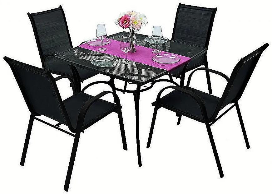 Sestava obsahuje: 4x Záhradné kreslo GLORIA (čierna), 1x Kovový stôl QUADRA 100×100 cm (čierna)