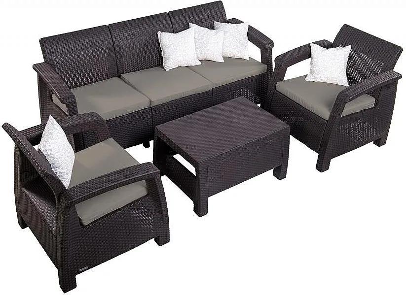 Dodávané v rozloženom stave Sestava obsahuje: 1x Záhradná ratanová pohovka CORFU LOVE SEAT MAX (hnedá), 1x Záhradná ratanová zostava CORFU WEEKEND hnedá