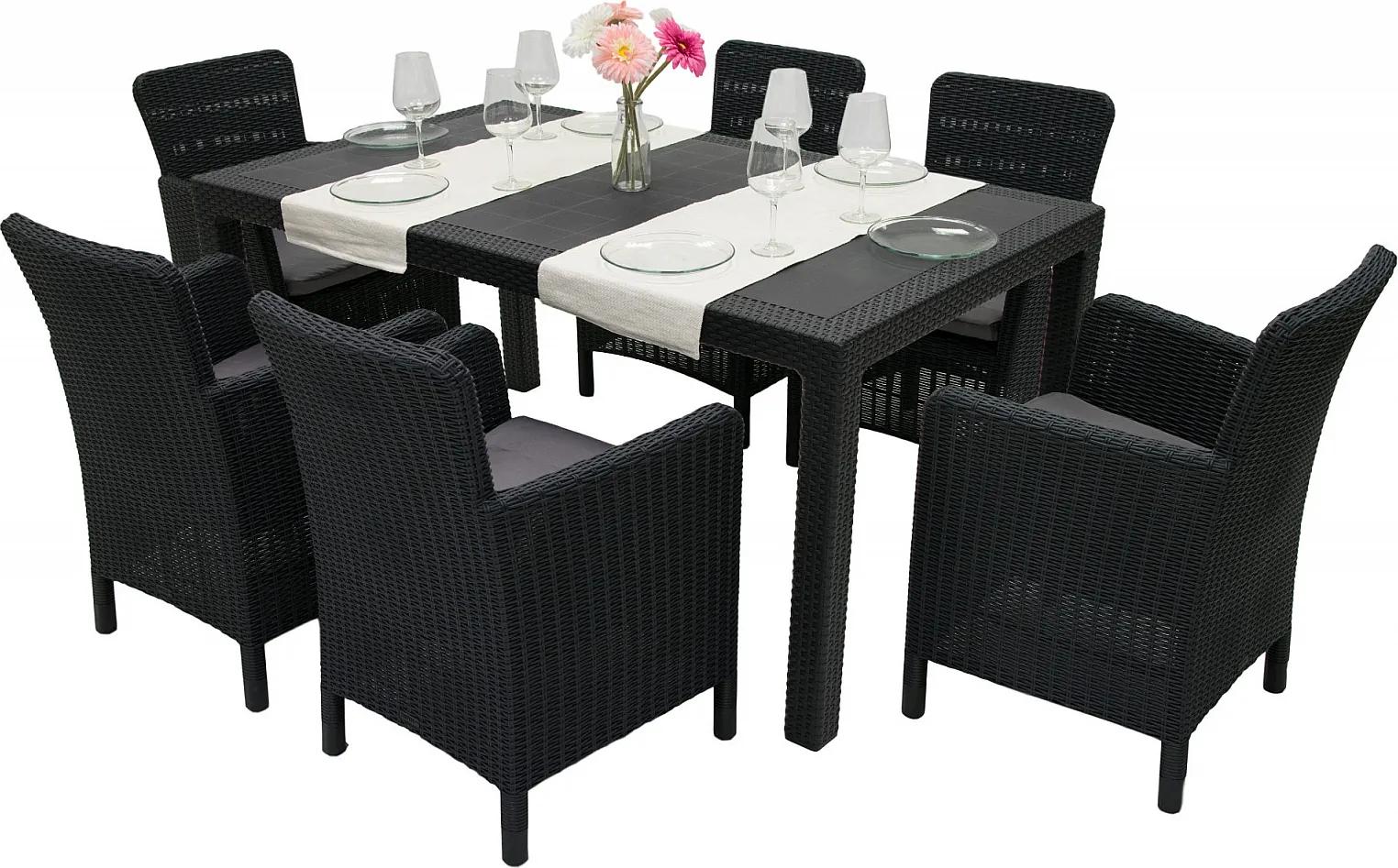 Ak vás produkt zaujal, pozrite si aj ostatné varianty zostavy Dante . Omrknúť môžete i ďalšie jedálenské zostavy z umelého ratanu – listovaného plastu v modernom dizajne, ktorými skvele vybavíte záhrady, terasy aj vnútorné priestory. Sestava obsahuje: 6x Záhradné kreslo z umelého ratanu DANTE DINNING (antracit), 1x Záhradný stôl z umelého ratanu MANHATTAN 161 x 95 cm (antracit)